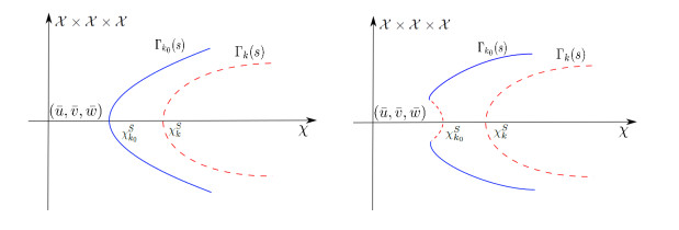 Figure 1. Pitch-fork bifurcation diagrams when case (ⅰ) in Theorem 4.3 occurs. The stable bifurcation curve is plotted in solid line and the unstable bifurcation curve is plotted in dashed line. The branch $\Gamma_{k_0}(s)$ around $(\bar u, \bar v, \bar w, \chi^S_{k_0})$ is stable if it turns to the right and is unstable if it turns to the left, while $\Gamma_{k}(s)$ around $(\bar u, \bar v, \bar w, \chi^S_{k})$ is always unstable if $k\neq k_0$
