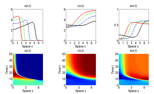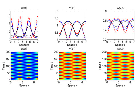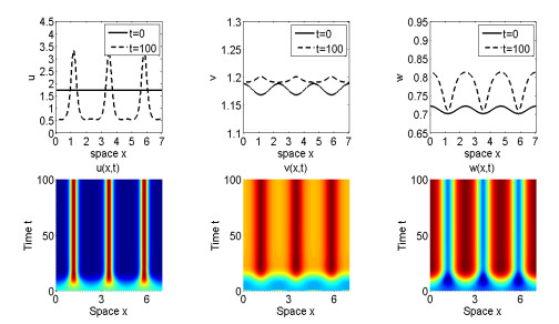 Figure 2. Formation of stationary patterns of (3.1) over $\Omega=(0, 7)$. System parameters in all the graphes are taken to be the same as in Table 1 except that $\chi=8$, which is larger than $\chi^S_{k_0}\approx6.05$ given in Table 1. Initial data are $(u_0, v_0, w_0)=(\bar u, \bar v, \bar w)+(0.01, 0.01, 0.01)\cos \pi x$, while the stable pattern has wave mode $\cos \frac{6\pi x}{7}$. These graphes support our stability analysis of the bifurcating solutions