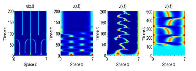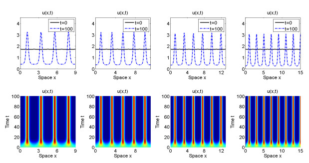 Figure 5. Formation of time-periodic spatial patterns of (3.1) over intervals with lengthes $L=9$, $11$, $13$ and $15$ respectively. System parameters in all the graphes are taken to be the same as in Table 3 except that $\chi=120$, which is slightly larger than $\chi^H_{k_0}$ given in Table 4. Initial data are $(u_0, v_0, w_0)=(\bar u, \bar v, \bar w)+(0.01, 0.01, 0.01)\cos \pi x$. These graphes support our stability analysis of the bifurcating solutions