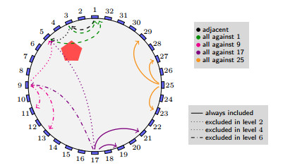 Figure 1. An illustration of the EIT measurement tank ($\Omega$), the electrodes $e_l$, with a sample of the injection patterns. In black we show the adjacent injections; in green all against $e_1$; in pink all against $e_9$; in magenta all against $e_{17}$; in orange all against $e_{25}$. Dashed injections are removed in the $2^{\text{nd}}$ challenge level; dotted ones in the $4^{\text{th}}$; dash dotted in the $6^{\text{th}}$