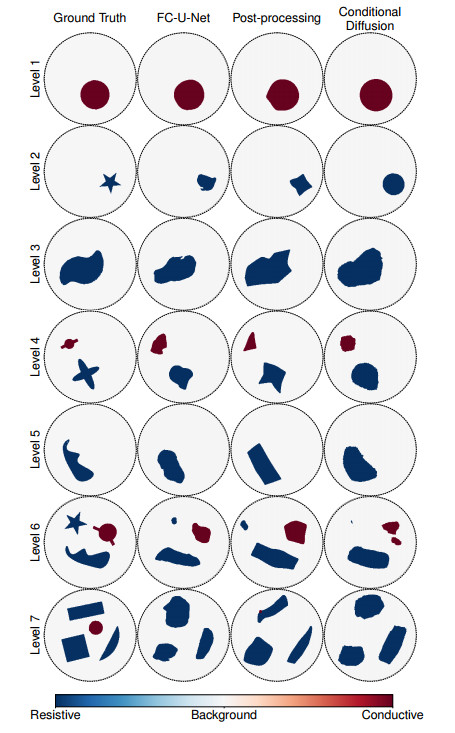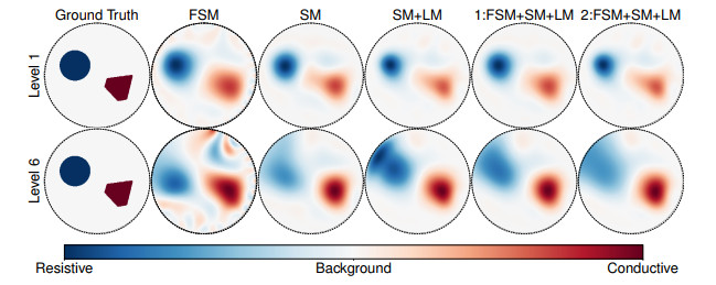 Table 2. Quantitative comparison of our three submissions via structural similarity index measure (SSIM). These are official challenge results, rounded to the nearest hundredth. The second place was achieved by Team ABC from the Federal University of ABC, Brasil. The third place was achieved by Team DTU from Technical University of Denmark. SSIM is averaged for a given sample between conductive and resistive inclusions. At each level the SSIM is summed across the three samples, and the overall sum for a method is summed across all samples and levels