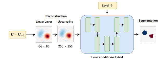 Figure 3. $ {\mathsf{FC}}\; {\mathsf{U-Net}}$ network. We first use a linear layer to map the measurements to a $ 64 \times 64 $ pixel grid, this is then bilinearly interpolated to the $ 256 \times 256 $ grid. The network is trained to output class probabilities using categorical cross-entropy loss. The class probabilities are converted to segmentation maps by assigning the class with highest probability