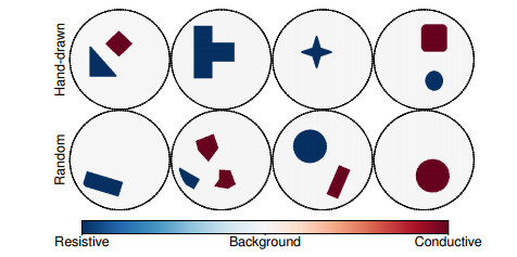 Top: Hand-drawn training phantoms. Bottom: Randomly generated training phantoms. For the visualisation, we only show the circular water tank. However, note that all models are trained using the square