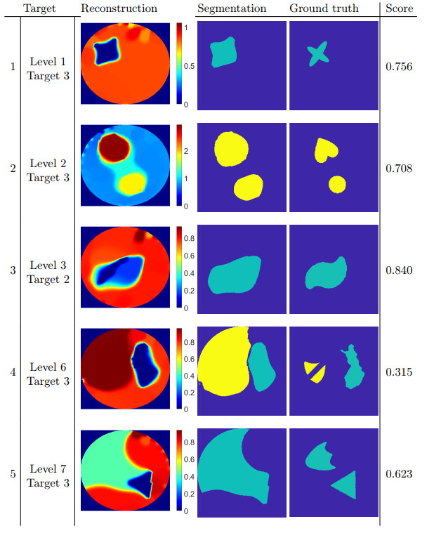 Figure 2. Example reconstructions and their segmentations computed from KTC2023 data. The reconstructions are two-dimensional conductivities in units of S. The segmentations and ground truths are color coded such that the background is blue, conductive inclusions are yellow, and resistive inclusions are cyan