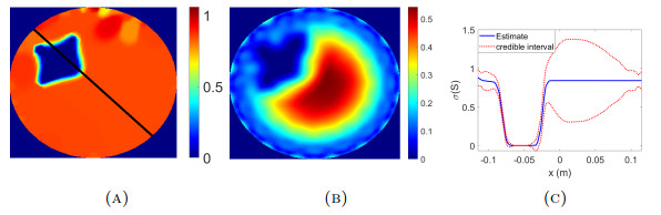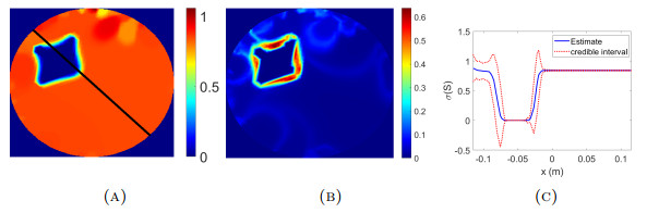 Figure 3. Uncertainty quantification (UQ) plots for the reconstruction of Target 1 (shown in (a)) computed using the total variation prior. (b) shows the spatial variation of the width of the 95% credible interval, and (c) shows the estimated conductivities and the 95% credible interval along the black line shown in (a)