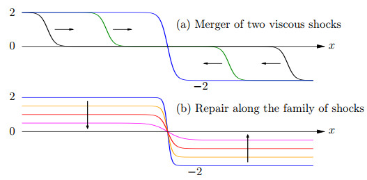 Figure 2. Illustration of the long-time behavior of the solution $ u(t,x) $ of (5.1) given by (6.12), (6.13). (a) Along a sparse sequence of times $ \tau_k \to +\infty $, the solution describes the merger of a pair of viscous shocks near the origin, as in the explicit solution (5.15). (b) Between the times $ \tau_k $ and $ \tau_{k+1} $, the solution slowly returns to zero along the family of steady shocks $ \phi_{\delta,-\delta} $, where $ 0 < \delta < 2 $. Both processes recur infinitely often, and are therefore reflected in the $ \omega $-limit set of the solution $ u(t,x) $, as asserted in Proposition 6.2