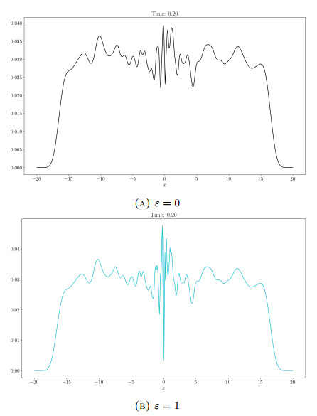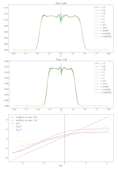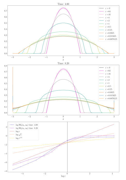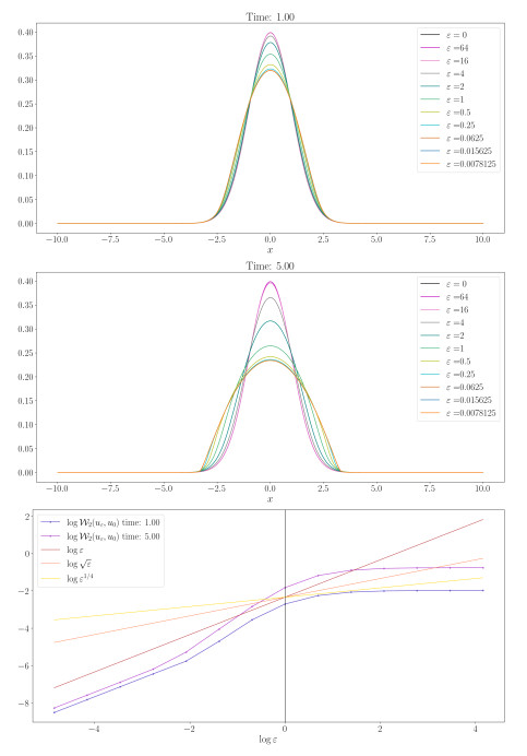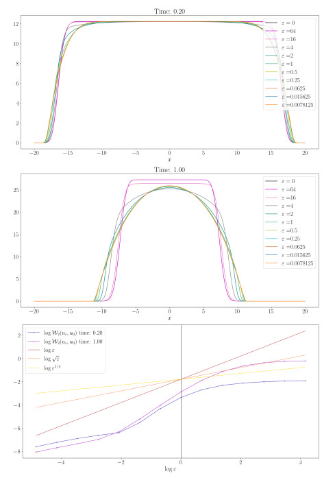 Figure 6. Porous medium equation and blob method: Order of convergence for $ \mathcal{W}_2( u_{\varepsilon}, u_0) $, $ u_0 $ (solution of (3.6)), and $ u_{\varepsilon} $ (solution of (3.7)). The computational domain is $ \Omega = (-10, 10) $, $ u^0(x) = u(x, 0) $, a the initial datum is generated using random values on a uniform grid of $ N = 2^{12} $ cells, with $ \Delta t = 0.01 $