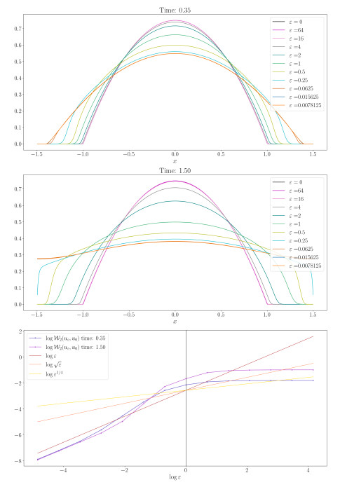 Figure 4. Porous medium equation and blob method: Order of convergence for $ \mathcal{W}_2( u_{\varepsilon}, u_0) $, $ u_0 $ solution of (1.3), and $ u_{\varepsilon} $ solution of (1.1). The computational domain is $ \Omega = (-3, 3) $, $ u^0(x) = (1-x^2)_+ $ is the initial datum, a uniform grid of $ N = 2^{10} $ cells was used with $ \Delta t = 0.01 $, and no-flux boundary conditions were imposed