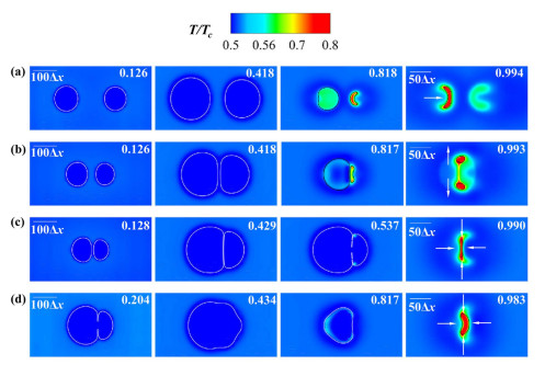 Figure 12. Snapshots of the bubble morphology and the temperature distribution for (a) the W mode, (b) the SF mode, (c) the SCC mode, and (d) the SGC mode of interaction between two unequal-sized bubbles. Both the white line and the black line are density contours with $ \rho = 0.25 $. The arrows in the subfigures represent the collapse direction in the final collapse stage, and the number in the upper right corner of each subfigure represents the dimensionless time