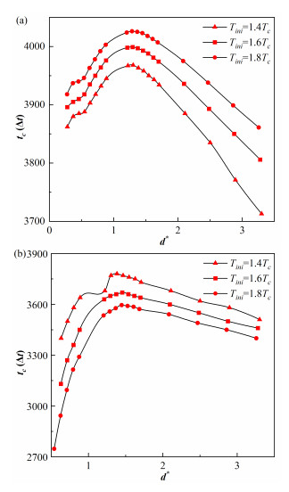 The lifetime of (a) the larger bubble, and (b) the smaller bubble with different initial distances between the two bubbles