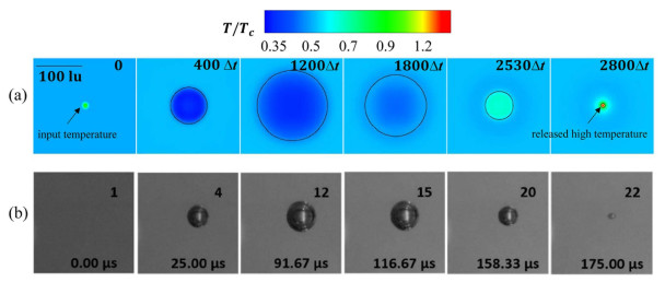 Figure 5. A qualitative comparison between the simulation results and the experimental results for the single cavitation bubble evolution process in an infinite quiescent liquid. (a) Temperature field (right) obtained using the present method, with contour line $ \rho = 0.23 $. (b) The experimental results obtained by Zhang et al. [55]