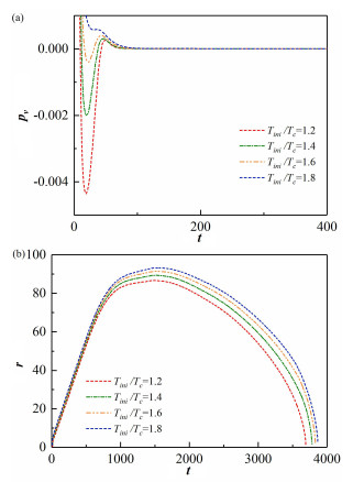 The evolution processes of (a) the pressure inside the bubble during the initial growth stage, and (b) the bubble radius with different