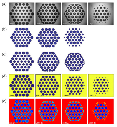 A comparison of the (a) experimental results reported by Bremond et al. [7] and (b) the SCMP pseudopotential LBM simulation proposed by Peng et al. [39], (c) the macroscopic numerical simulation obtained using the PhantomCloud model [8], (d) the macroscopic numerical simulation obtained using the 3DYNAFS-BEM model [8], and (e) the results obtained with the present LB model