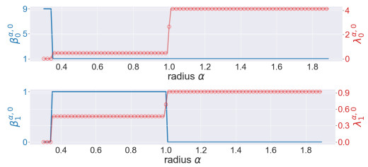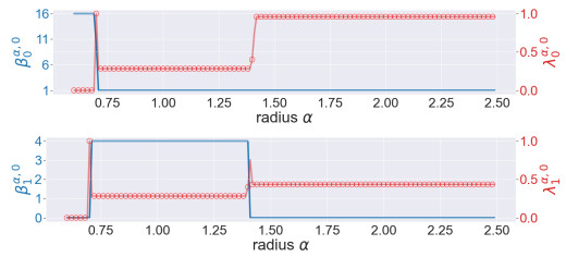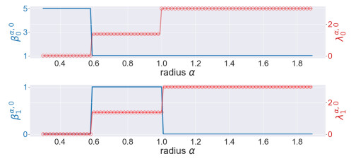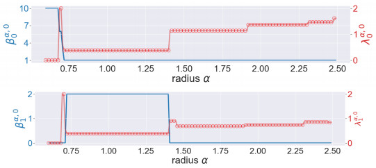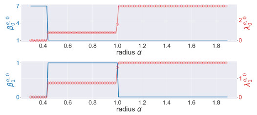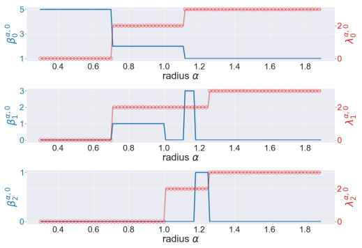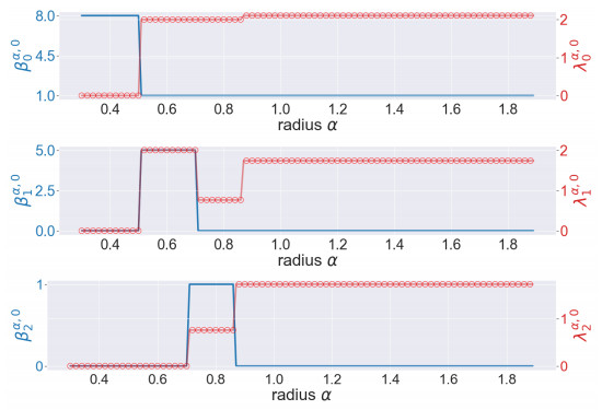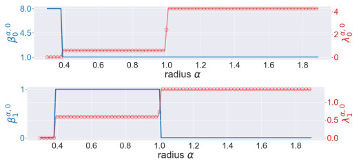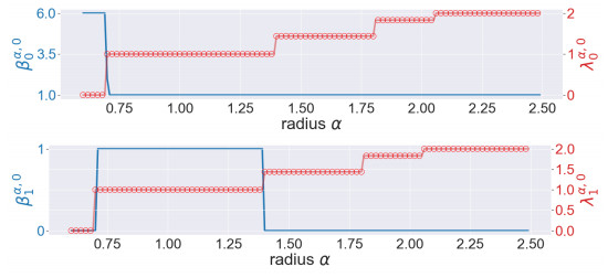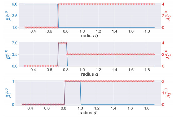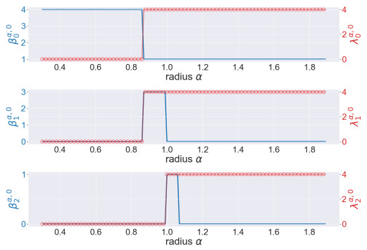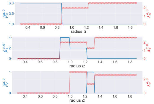 Figure 4. The illustration of the persistent Betti numbers $ \beta_{q}^{\alpha, 0} $ and the smallest nonzero eigenvalues of persistent Laplacians $ \lambda_{q}^{\alpha, 0} $ against the radius $ \alpha $ for the pentagon. The persistent Betti numbers are shown by the blue line. The smallest nonzero eigenvalues calculated by HERMES and Bertini are shown by a red line and red circles, respectively and one can see that they almost coincide. The half edge length is approximately $ \sin(\pi/5) \approx 0.58 $