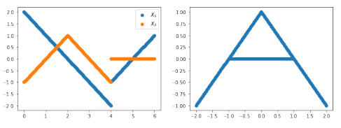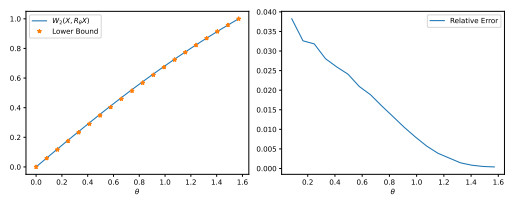 Figure 5. (Left) $ X $ drawn from the uniform distribution on the unit circle in $ \mathbb{R}^2 $ as in Example 3.1. Shown is the relative error between the Wasserstein distance and the upper bound. (Right) Relative error between Wasserstein distance and upper bound for $ X $ drawn from the uniform distribution on $ [-\frac12,\frac12] $ in $ \mathbb{R}^2 $ as in Example 3.2