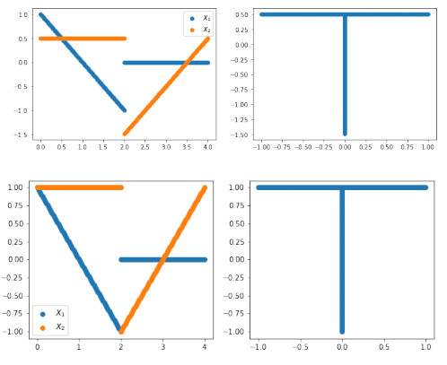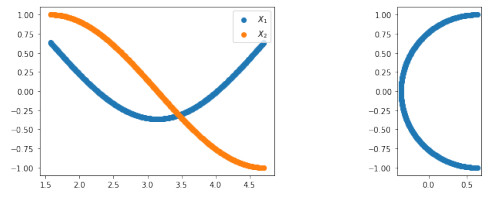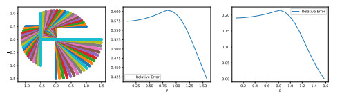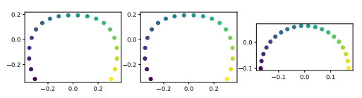 (Left) Wassmap embedding of rotated copies of letter T parametrized by (11). (Center) Same for T parametrized by (12). (Right) MDS embedding using the lower bound of Theorem 2.10 for T parametrized by (11)