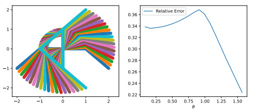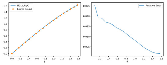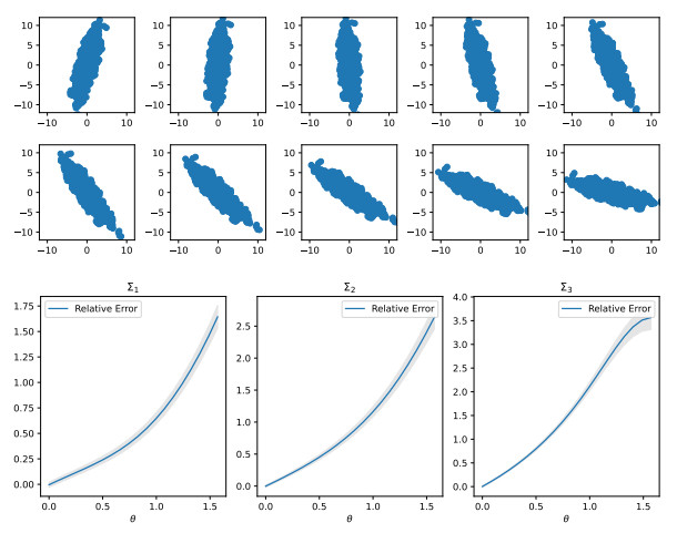 Figure 4. Figure illustrating Example 2.20. (Top) Sample of $ X\sim\mathcal{N}(0,\Sigma_1) $ under the map $ T_\alpha\circ R_\theta\circ S_\lambda $ for $ \theta\in[0,\frac{\pi}{2}] $ with $ \alpha = 0 $, $ \lambda = \begin{bmatrix} \frac12 \\ 2 \end{bmatrix} $. (Bottom) Relative error (upper bound $ - W_2(T_\alpha\circ R_\theta\circ S_\lambda X,X))/W_2(T_\alpha\circ R_\theta\circ S_\lambda X,X) $ for $ X\sim(0,\Sigma_i) $, $ i = 1,2,3 $ using the upper bound of Theorem 2.17 (which is valid because Gaussians satisfy equality in Theorem 2.10). Error bars show one standard deviation of the error over 20 repeated trials