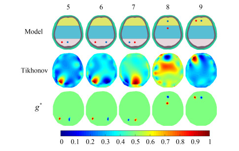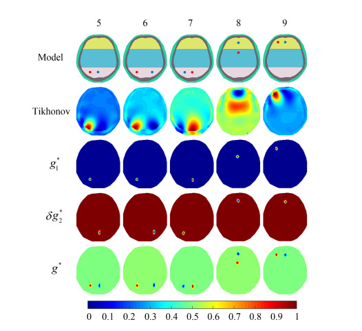 Figure 5. Reconstructed images for ICH and secondary ischemia of five models (Model 5 to Model 9). The second row displays the reconstruction based on the traditional Tikhonov method. The third row and the fourth row show the reconstructed images of ICH and secondary ischemia, respectively. The last row presents the reconstructed images of simultaneous ICH and secondary ischemia