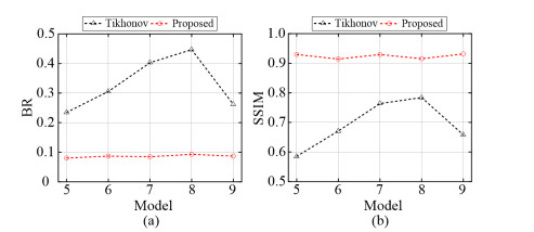 Quantitative evaluation of five models (Model 5 to Model 9) in the simultaneous reconstruction. (a) Blur radius; (b) Structural similarity