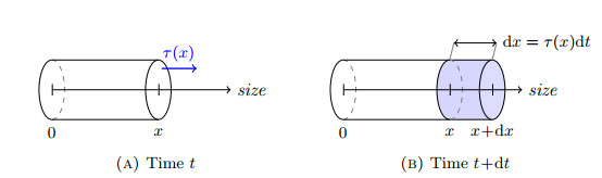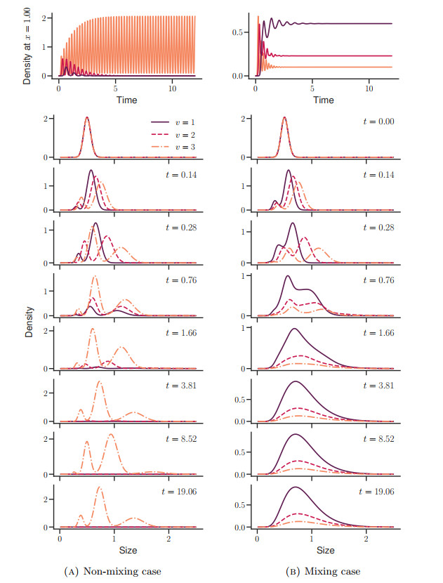 Figure 2. Time evolution of the size distribution per feature, either the whole distribution at a few times (bottom) or at many times but only at size $ x = 1 $ (top). Obtained with coefficients $ \tau (v, x) = vx $, $ \gamma(v, x) = x^2 \tau(v, x) $ and the two variability kernels $ \kappa^{red} $ (2a) and $ \kappa^{irr} $ (2b)