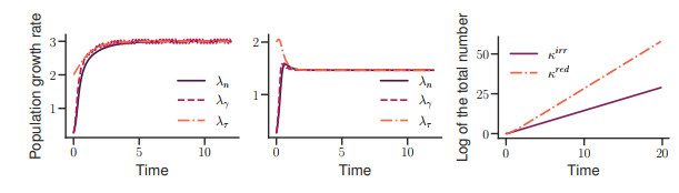 Figure 3. Time evolution of the estimates of the instantaneous population growth rate obtained with coefficients $ \tau (v, x) = vx $, $ \gamma(v, x) = x^2 \tau(v, x) $ and the two variability kernels $ \kappa^{red} $ (left) and $ \kappa^{irr} $ (middle). For any $ t>0 $, $ \lambda_n(t) $ is obtained by linear regression of the log of the total number, $ s \mapsto \ln \big( \int \! \! \! \int_{ \mathcal{S}} n(s, v, x) \, {\text{d}} v {\text{d}}x \big) $ (right), on the time interval $ \big[ \frac{t}{2}, t \big] $.