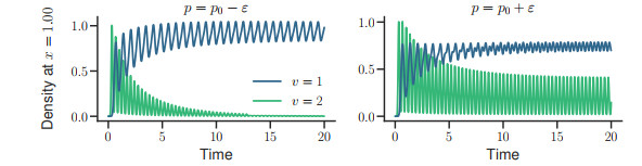 Figure 4. Time evolution of the size distribution per feature at size $ x = 1 $, for the variability kernels $ \kappa^{_{F t S}}(p_0 \pm \varepsilon) $, with $ p_0 $ defined by (22) and $ \varepsilon = 0.05 $ to show that $ p_0 $ appears as a critical value for $ p $ in the case Fastest to Slowest. Obtained with the coefficients $ \tau (v, x) = vx $, $ \gamma(v, x) = x^2 \tau(v, x) $