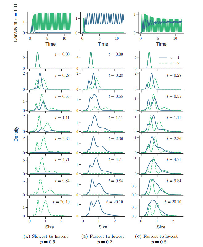 Figure 5. Time evolution of the size distribution per feature, either the whole distribution at a few times (bottom) or at many times but only at size $ x = 1 $ (top). Obtained with coefficients $ \tau (v, x) = vx $, $ \gamma(v, x) = x^2 \tau(v, x) $ and the variability kernels $ \kappa^{_{S t F}}(0.5) $, $ \kappa^{_{F t S}}(0.2) $ and $ \kappa^{_{F t S}}(0.8) $. The corresponding Malthus parameters were estimated to be (up to $ 10^{-3} $ precision) $ v_2 = 2 $, $ v_1 = 1 $, and $ \lambda_{2, 0.8} \approx 1.356 $, respectively, in accordance with the conjecture (see Table 2)