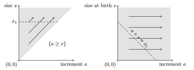 Domain of the model, with respect to the choice of variables to describe the bacterium. Grey: domain where the bacteria densities may be positive. Arrows: transport. Left: size increment/size. Right: size increment/birth size. Dashed: location of cells of size $x_1$